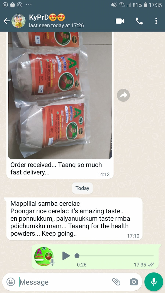 Since 2021, the Appatha store in Virudhunagar has been offering traditional methods of food grains to both elders and pregnant women, as well as babies. Their products include a health mix, fresh pure oil and hair oil, as well as old traditional rice.